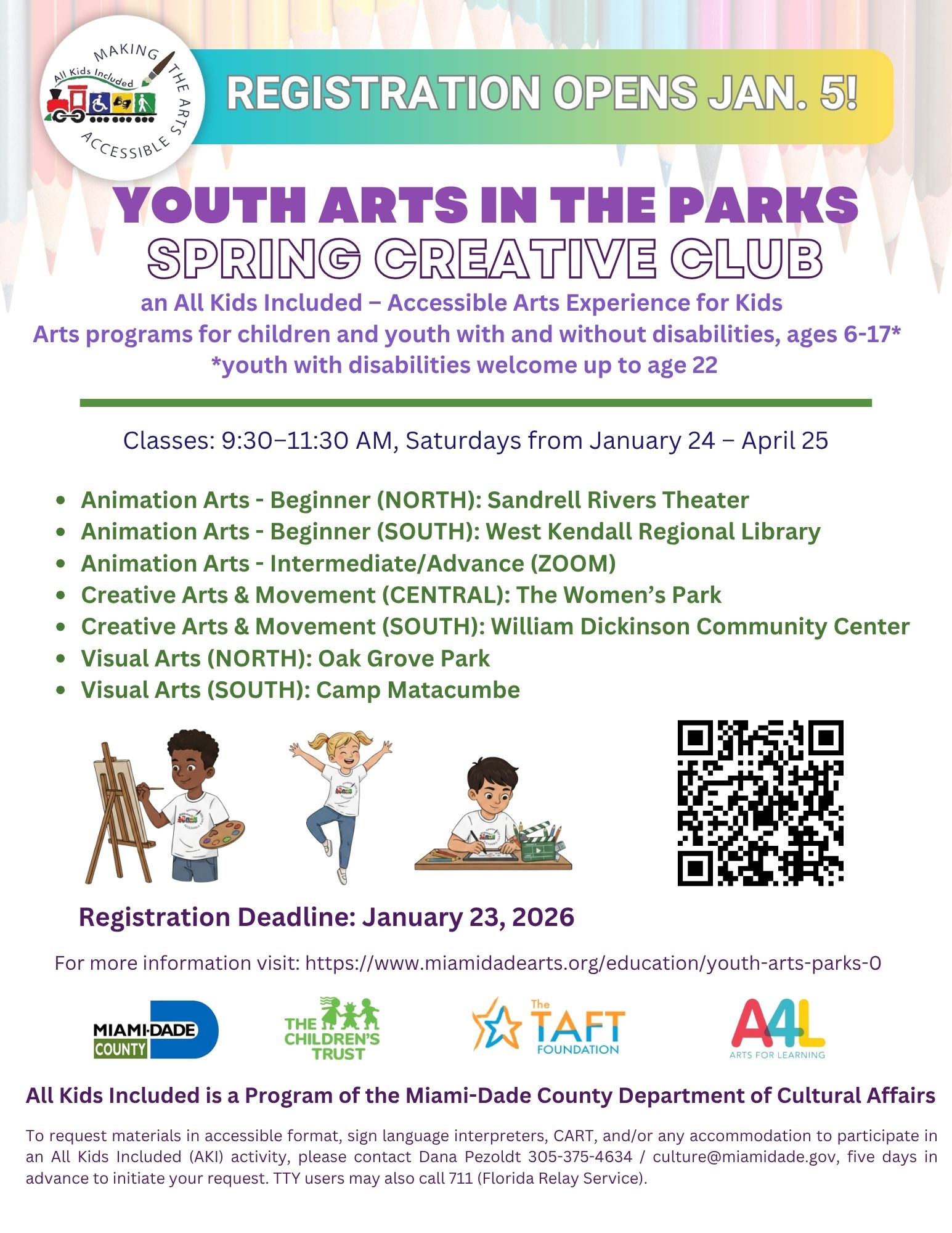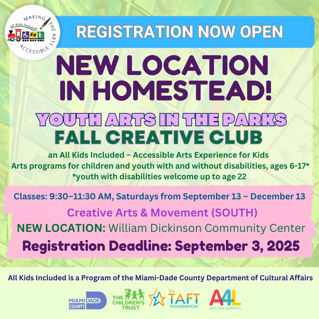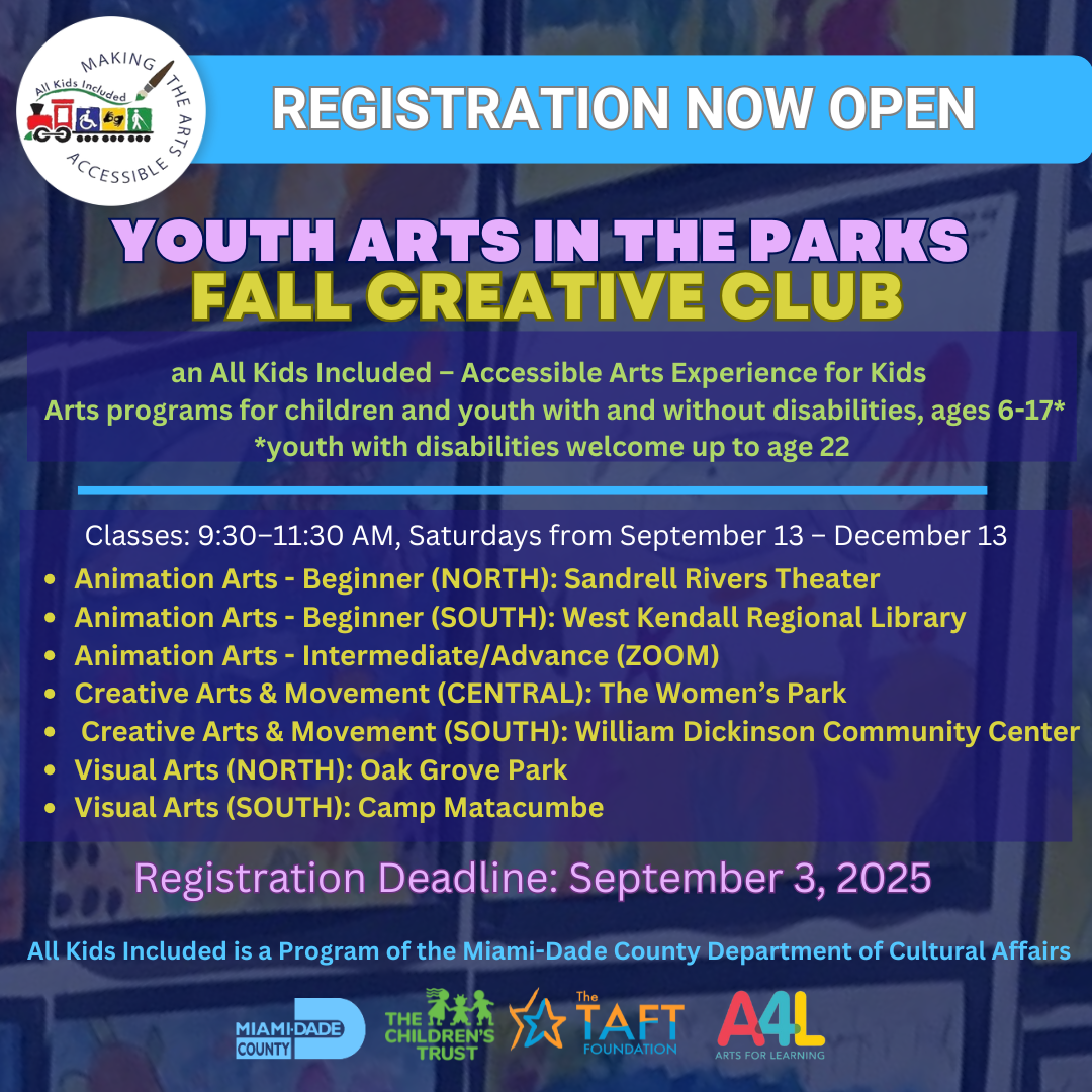 Youth Arts in the Parks is presented by the Miami-Dade County Department of Cultural Affairs All Kids Included initiative in partnership with Miami-Dade County Parks, Recreation and Open Spaces Therapeutic, Recreation & Inclusion, Miami-Dade Public Library System, The Sandrell Rivers Theater, and Arts for Learning/Miami.